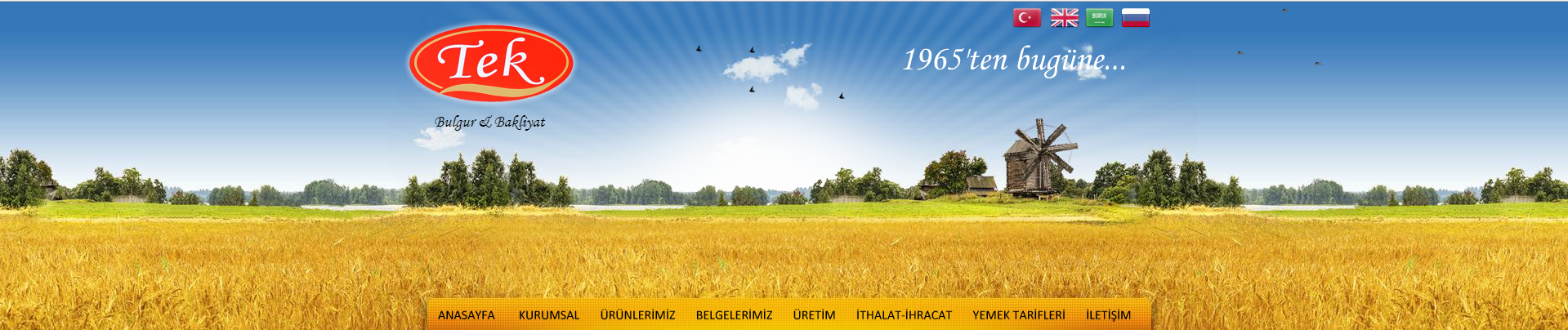 Tek Bulgur Gaziantep/Türkiye’de kurulmuş bulgur üretimini esas alan , bulgur ve aşurelik buğdayda hem üretici hem ihracatçı bir firma olup tedarikçilere,ithalatçılara, toptancılara, distiribütörlere ve kendileriyle işbirliği yapmak isteyenlere diğer gıda ürünlerini de sağlayan uzman bir firmadır.