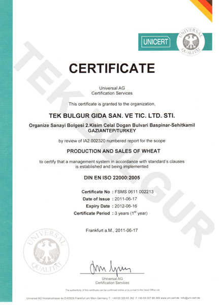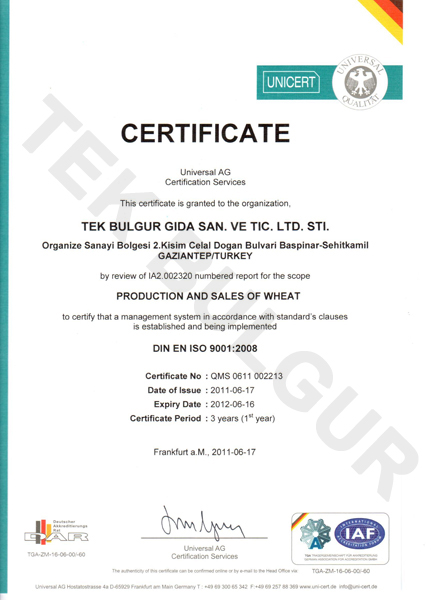 Adres : 2.Organize Sanayi Bölgesi Celal Doğan Blv. No:24 Başpınar / GAZİANTEP / TÜRKİYE Telefon : +90 342 337 26 71 (3 Hat) Faks : +90 342 337 26 73 E-mail : info@tekbulgur.com |